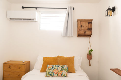 Queen size memory foam bed with an en suite bathroom. This room complies with wheelchair-friendly dimensions and has access to the outdoor deck and kitchen.